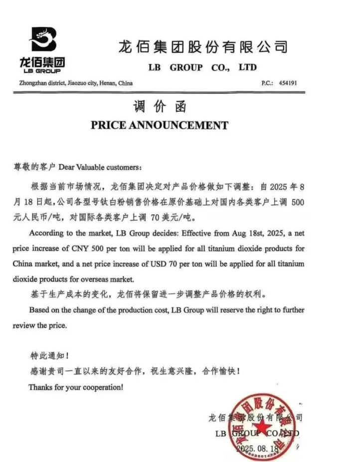 编者按 近期,多种化工品、工业制品、原料价格掀起上涨浪潮,引发市场的广泛关注。价格跳动的曲线背后,藏着市场最关切的三重追问:此轮涨价由何驱动?这波涨势能持续多久?产业链上下游企业的业绩能否借此迎来修复契机,又将如何重塑行业竞争格局? 春江水暖“价”先知。涨价,是经济脉络复苏中最灵敏的脉动信号。上海证券报微信公众号推出《市场探“涨”》系列报道,意在凸显这一系列价格变化背后的市场活力与商业逻辑变迁。透过“涨”声,倾听复苏脚步;在潮起潮落之间,探见未来可期。 低迷多时的钛白粉涨价了。 近日,钛白粉龙头龙佰集团发布涨价函:8月18日起,公司各型号钛白粉销售价格上调,其中国内客户上调500元/吨,国际客户上调70美元/吨。基于生产成本的变化,龙佰将保留进一步调整产品价格的权利。